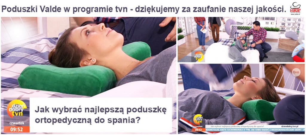Zaprezentowane zostało jak należy ułożyć poprawnie poduszkę oraz jak powinniśmy ją dobrać odpowiednio aby głowa i szyja leżała poprawnie, a kręgosłup anatomicznie. Jesteśmy niezmiernie zadowoleni, że to akurat nasze produkty zostały użyte w tym programie i to właśnie one prezentowały się najlepiej – co widać po leżącej na poduszce Valde Vila B4 modelce. Prezentowana poduszka wykonana jest z pianki układającej się do ciała (pianka Valde memory) o anatomicznym kształcie z profilem pod głowę i szyję. Dostępna jest w szerokiej gamie kolorystycznej. Nasze produkty są opracowywane latami, posiadają certyfikaty, są bezwonne i bezpieczne w użytkowaniu.